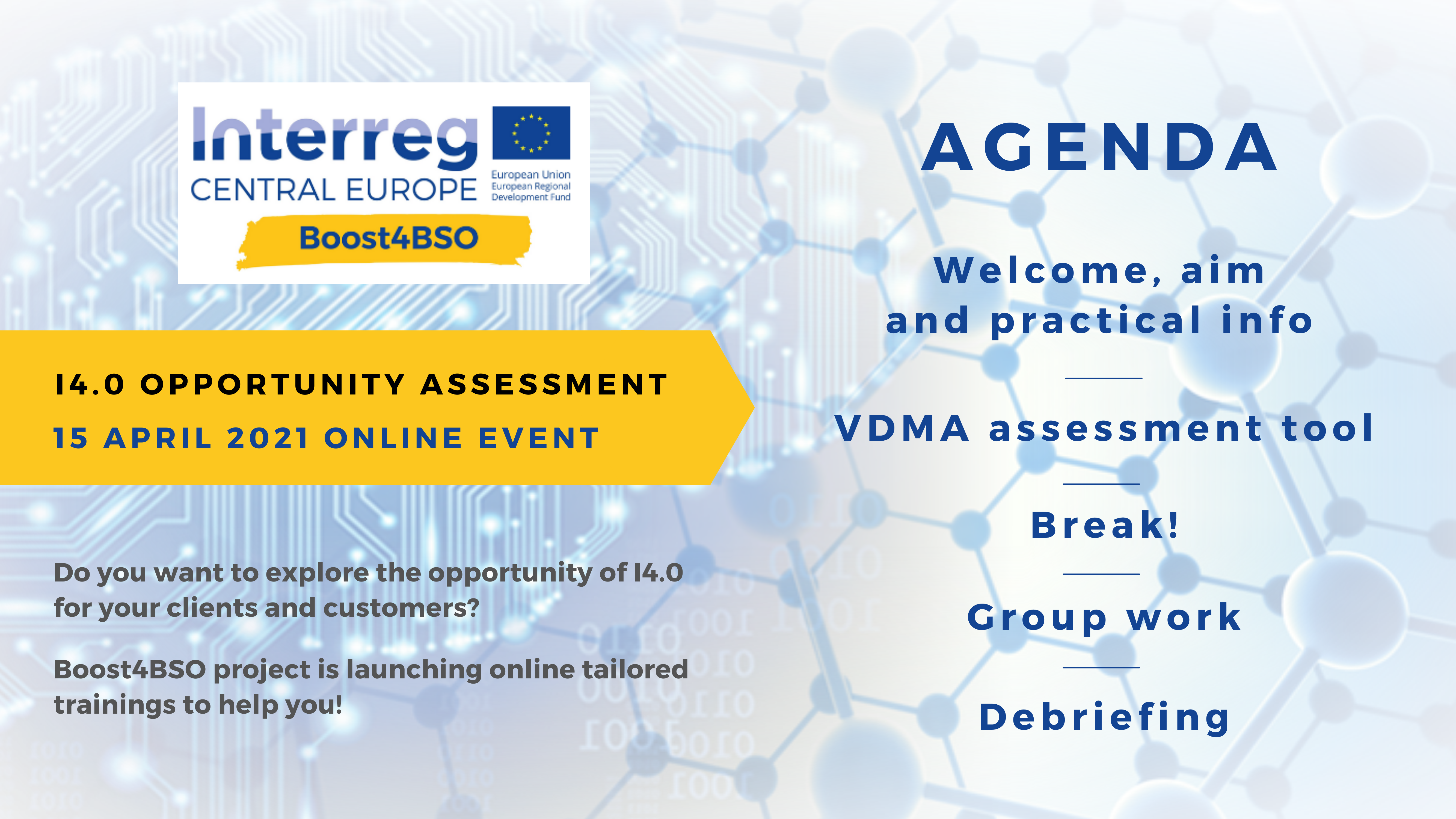 The objective of this round of meetings is to share methodologies, tools, best practices and a business support models aimed at encouraging investments in Industry 4.0 with the associated BSOs of the Central European area.